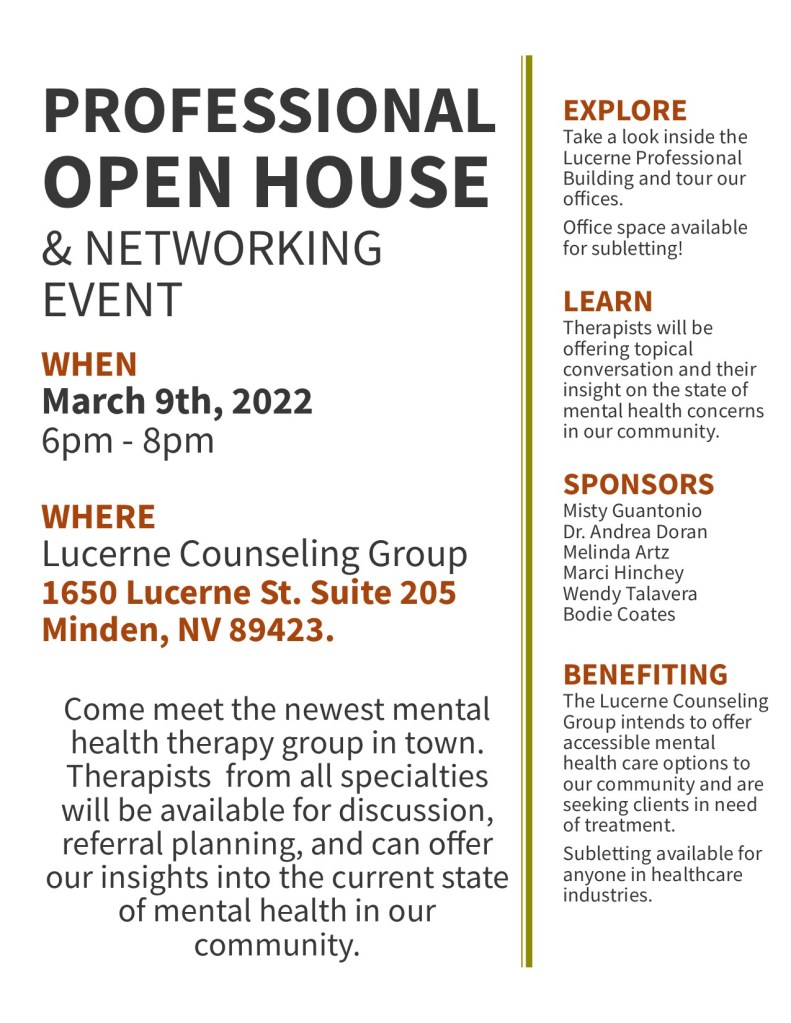 Please join the unofficially titled “Lucerne Counseling Group” on March 9th, 2022 at the Lucerne Professional building located at 1650 Lucerne St. Suite 205, Minden, NV 89423. If you get lost, it’s the little two-story Snow White cottage looking building a bit behind The Full Belly Deli.